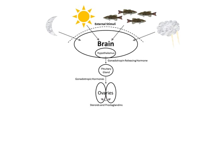 External stimuli that prompt the reproductive process in aquatic species include photoperiod, lunar cycles, ambient temperature or temperature fluctuations, precipitation events, changes in water currents and depth, changes in barometric pressure, presence and behaviours of other fish, access to suitable spawning substrates and changes in water quality – especially salinity, hardness, dissolved oxygen and pH.