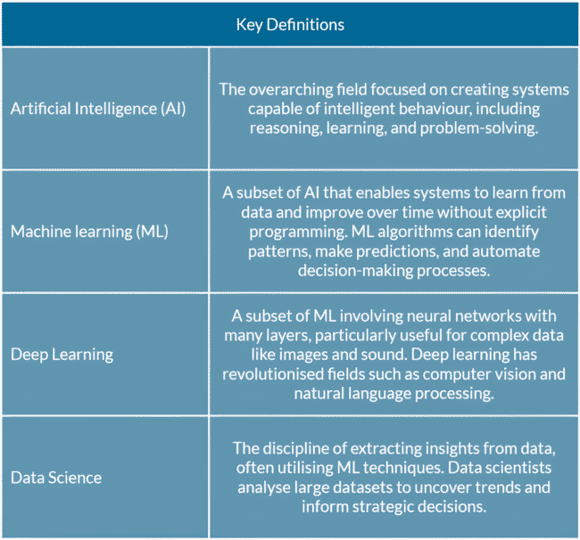 AI is an umbrella term encompassing various technologies that enable machines to mimic and enhance human intelligence. Within this field, several concepts are critical to understand: