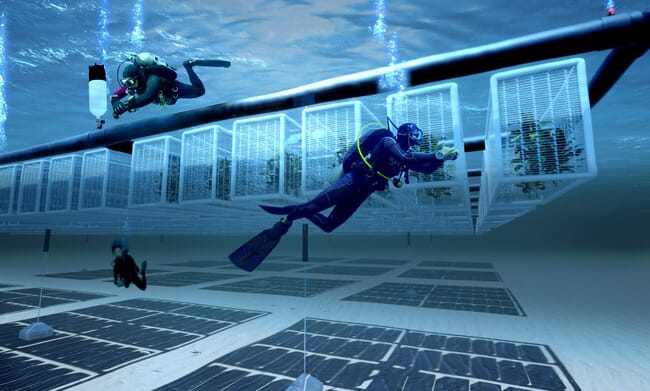 Most importantly, prospective investors are not interested unless the farm infrastructure is protected from storms, typhoons and hurricanes. To overcome this risk, with a few days’ notice, the HDPE pipes can be filled with seawater, allowing the farming structure to be lowered to where there is an exponential decrease in ocean energy from winds and currents caused by storms. Using compressed air from scuba tanks, the structure can be resurfaced for deployment in the optimum ocean depth.