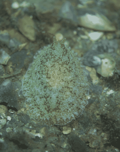 A side-gilled sea slug amongst discarded mussel shells beneath the lines
