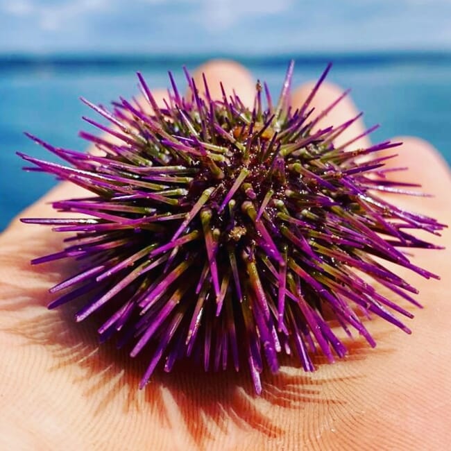Key environmental benefits include carbon capture, water filtration and habitat creation. The farm provides food, shelter and a nursery area for a huge variety of species, including sea urchins, scallops, brown crab, lobster and shrimps, which we can see on the lines and on the seabed beneath them. The farm structure protects the seabed from disturbance from other activities. It essentially forms a bridge between the pelagic and demersal zones and performs a lot of the functions an undisturbed seabed reef would.