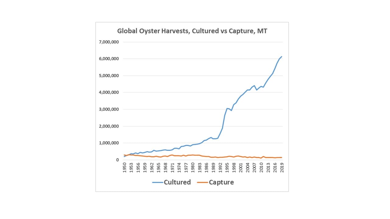 When many people think of oysters they envision a cluster of odd-shaped, rock-like objects, typically growing on some hard surface on or near the seafloor. According to FAO figures, in 1952 global oyster aquaculture production surpassed wild harvests for the first time – with 306,930 and 302,526 tonnes reported, respectively. Aquaculture production has consistently exceeded wild oyster harvests since that time, and in 2019 accounted for 6,125,606 tonnes, compared to 133,984 tonnes of wild-harvested. Traditional culture methods relied (and still rely, in many regions) on natural setting of wild larvae on suitable benthic substrates. But there are other ways to grow oysters, and these techniques can result in significantly greater production volumes.